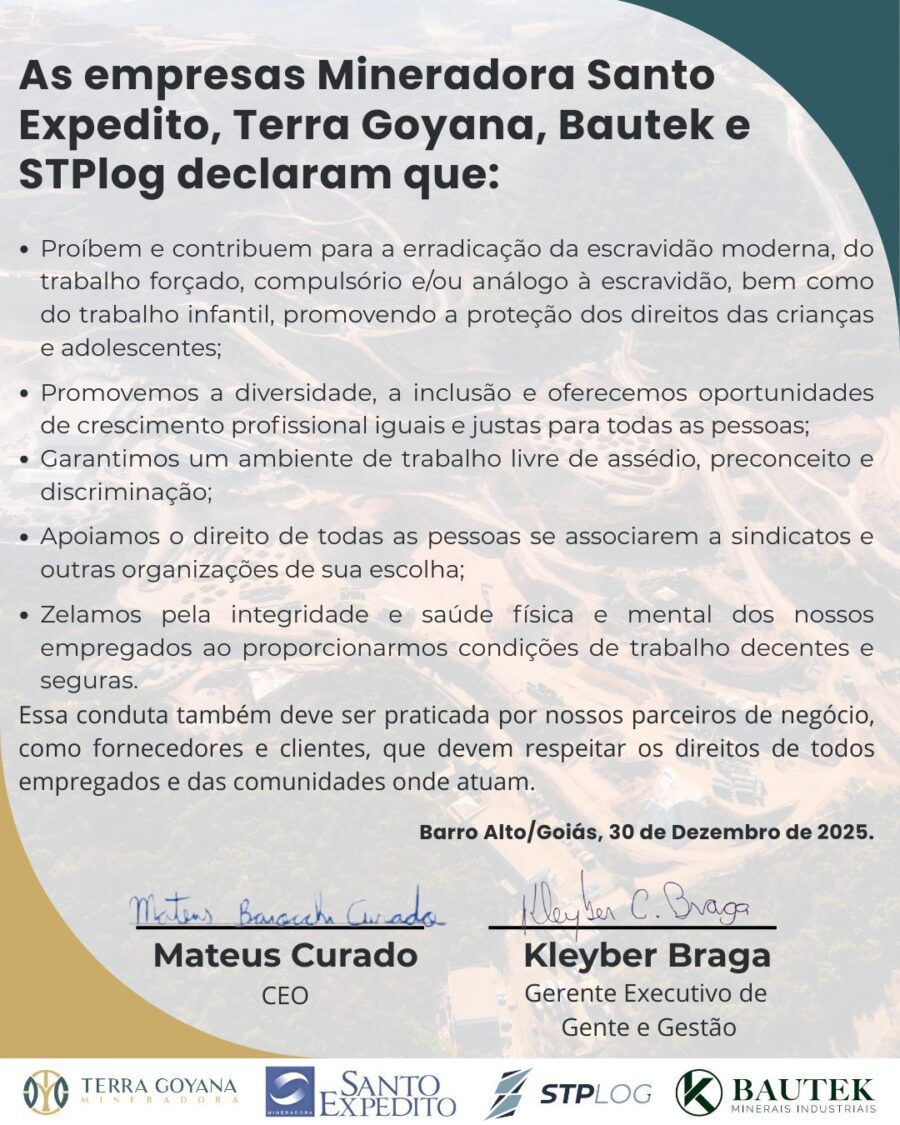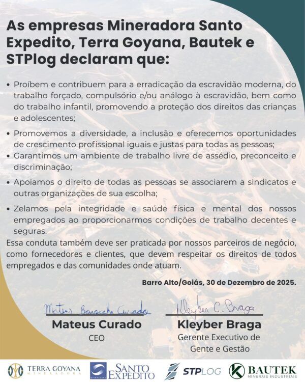 Reafirmamos nosso compromisso com a promoção dos direitos humanos, do trabalho decente e de relações profissionais éticas e responsáveis. As empresas Mineradora Santo Expedito, Terra Goyana, Bautek e STPlog atuam de forma ativa na proibição e contribuem para erradicação da escravidão moderna, do trabalho forçado, compulsório, análogo à escravidão ou trabalho infantil, respeitando integralmente a dignidade humana.